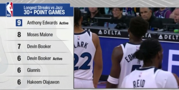 开云体育入口-面对爵士连续30+场数榜:爱德华兹9场最多 摩西·马龙第2 布克第3