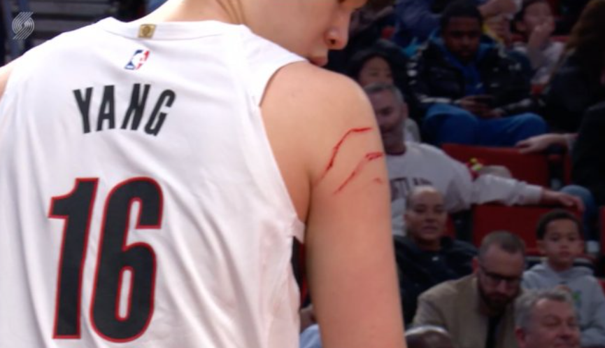 在第四节,杨瀚森拼到个人5次犯规下场休息,可以清晰地看到他的肩膀有两道血印子,还有血在渗出,绝对是 浴血奋战。